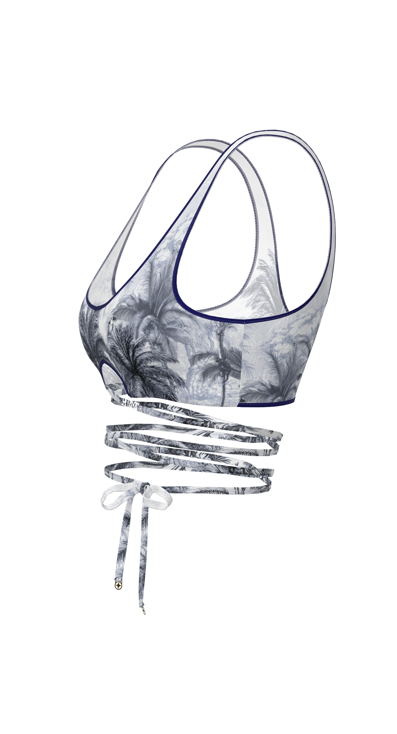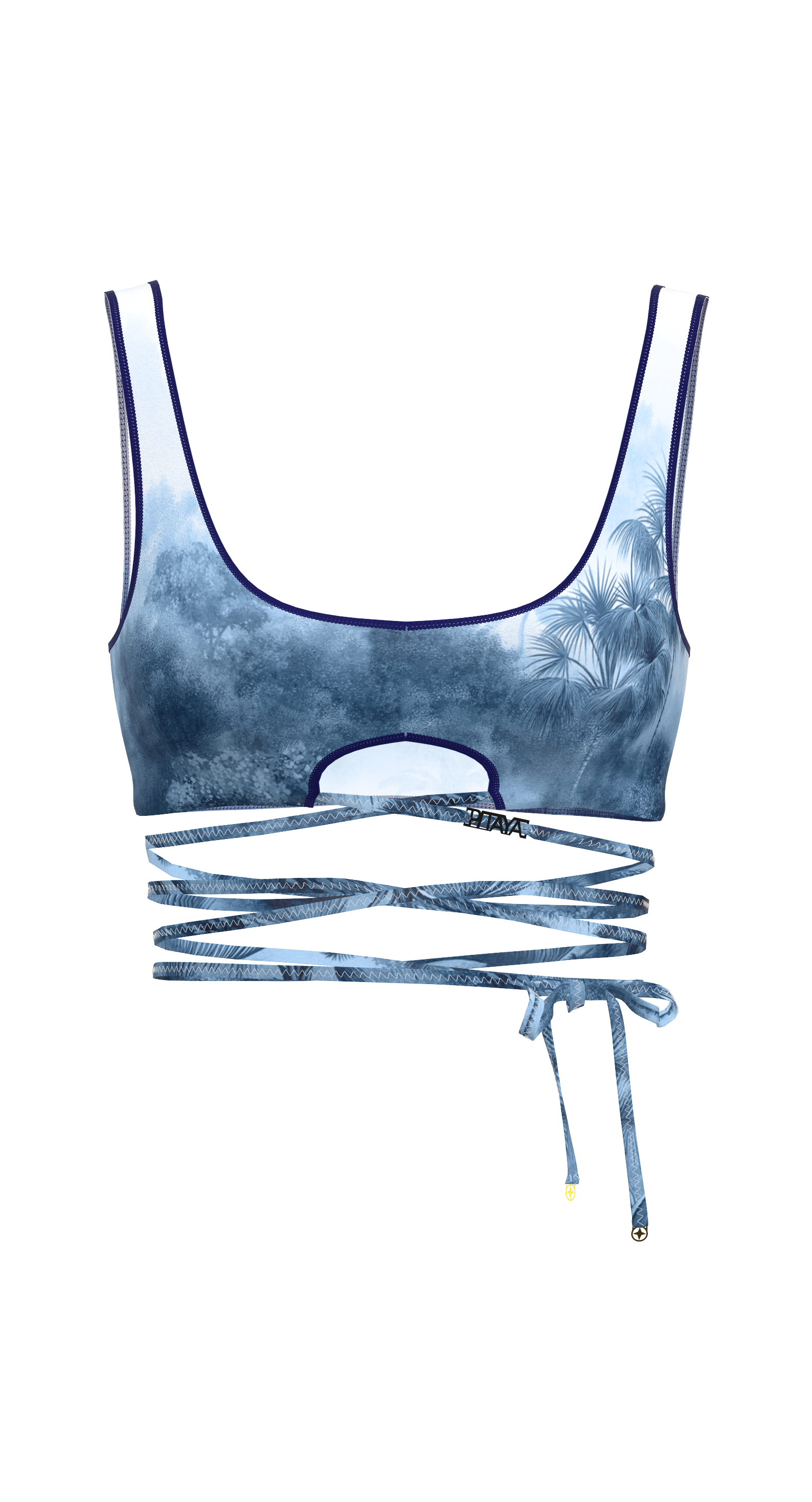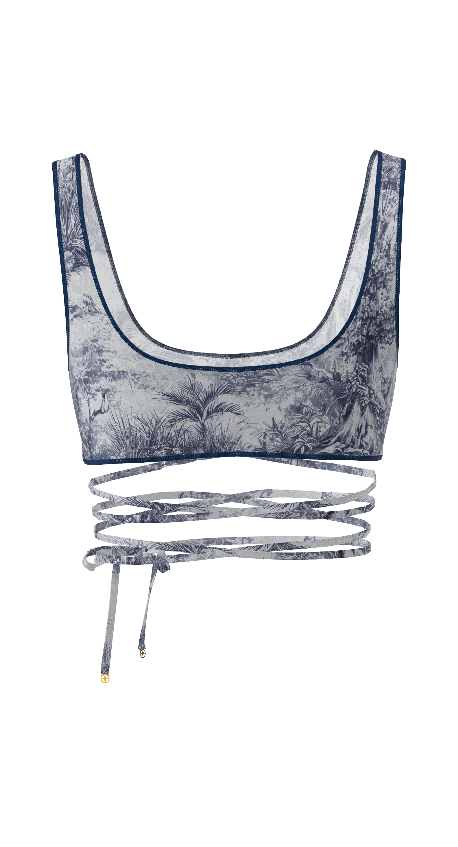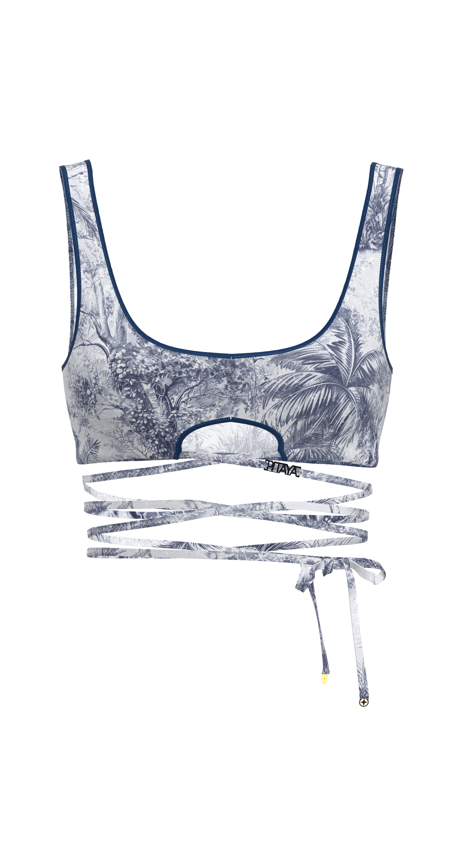 Biarritz is a tie-front top that beautifully accentuates the waist and creates a striking silhouette. The deep neckline, delicate trim, and decorative cutout under the bust add accent. The ties can be wrapped around the body to create your own variations. Perfect as a swimsuit top or as part of an outfit.