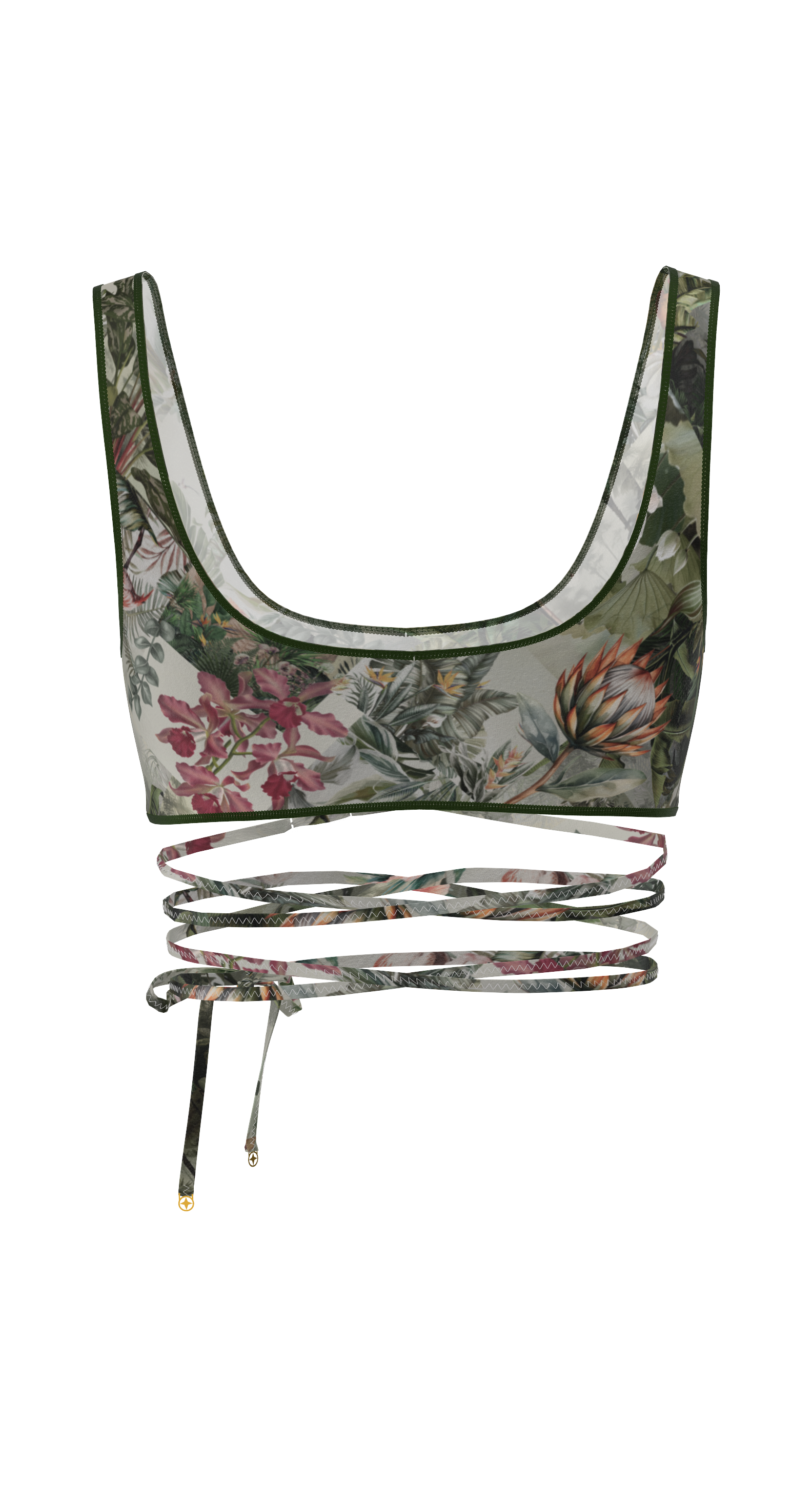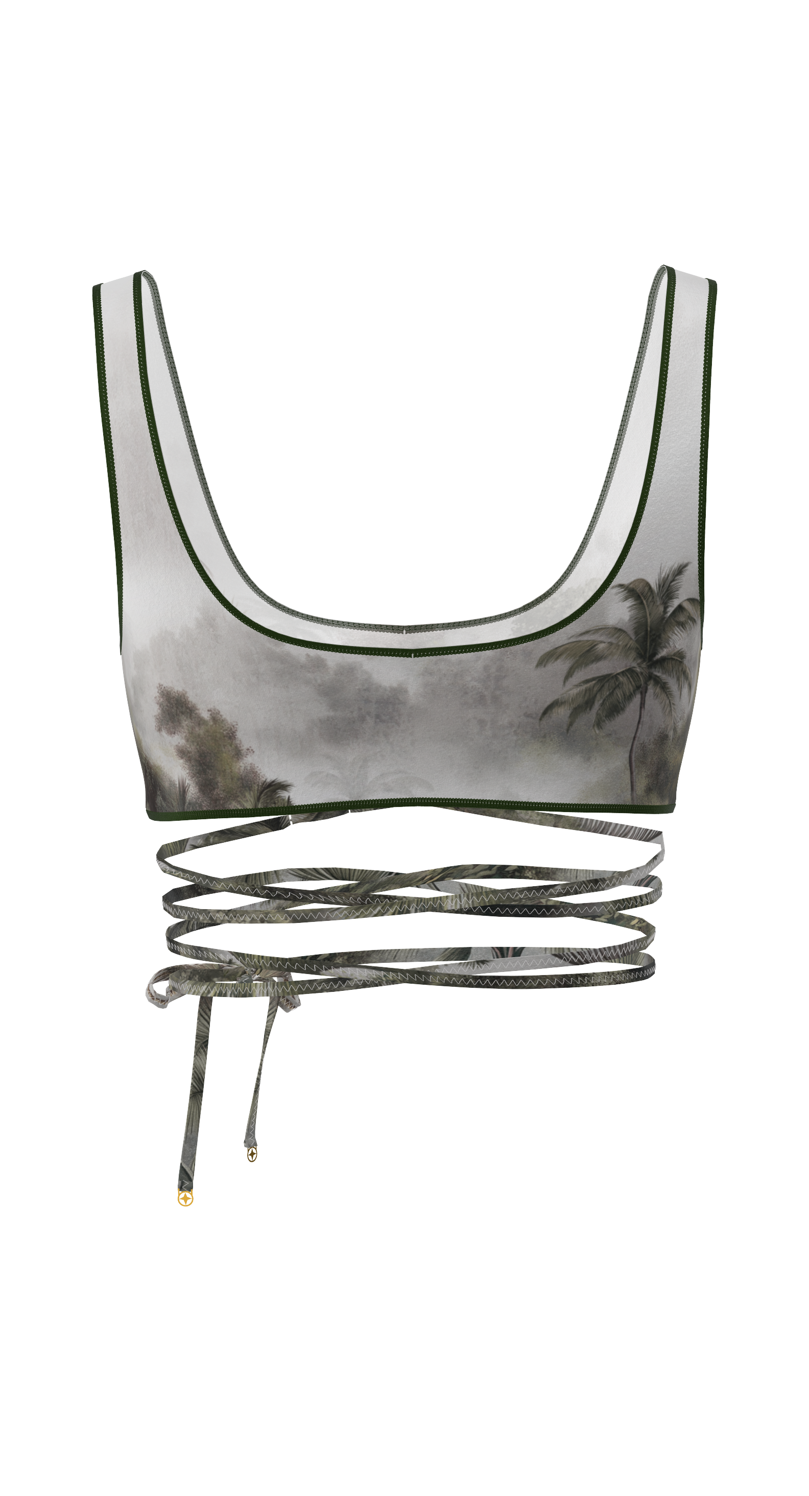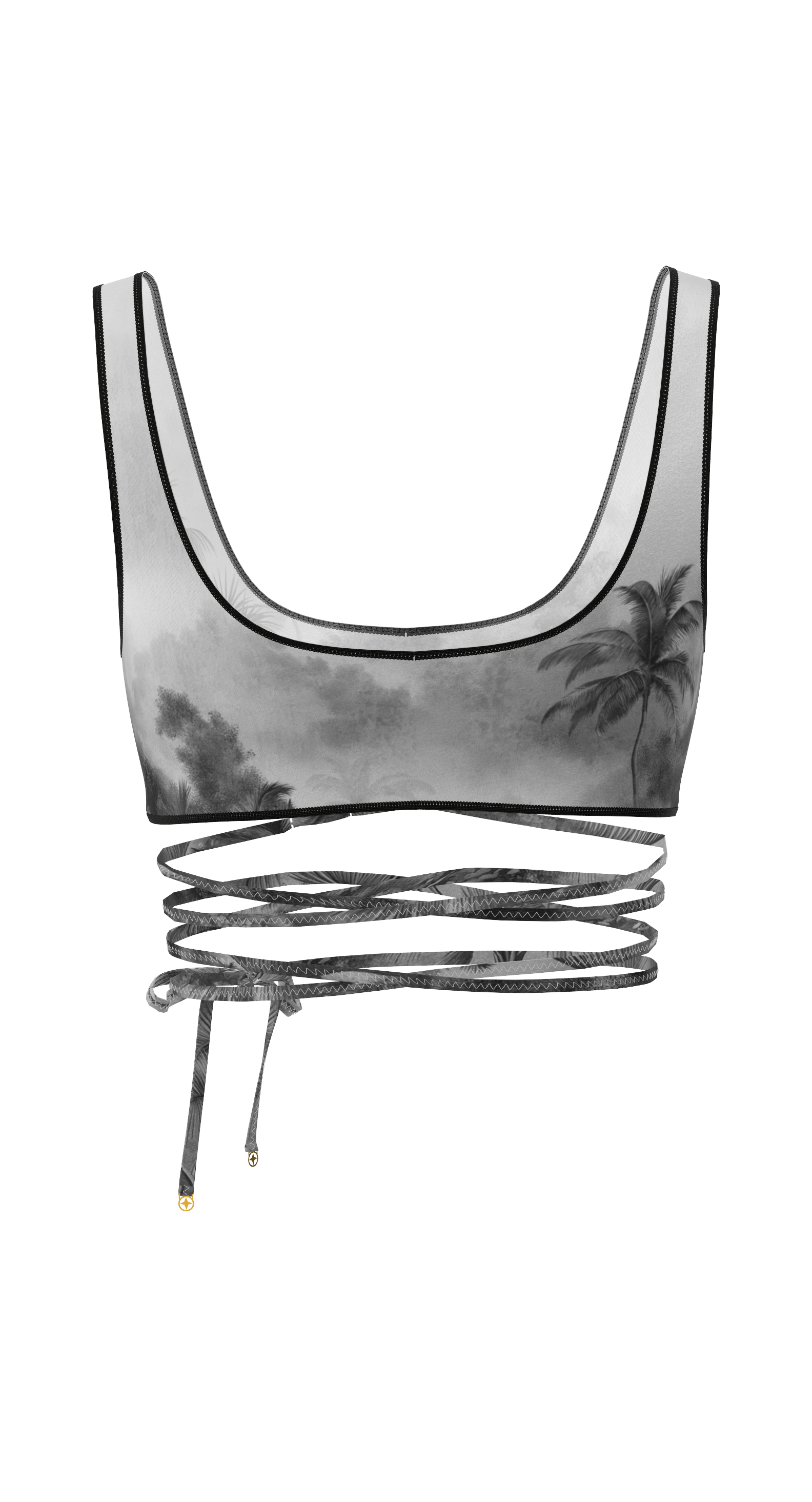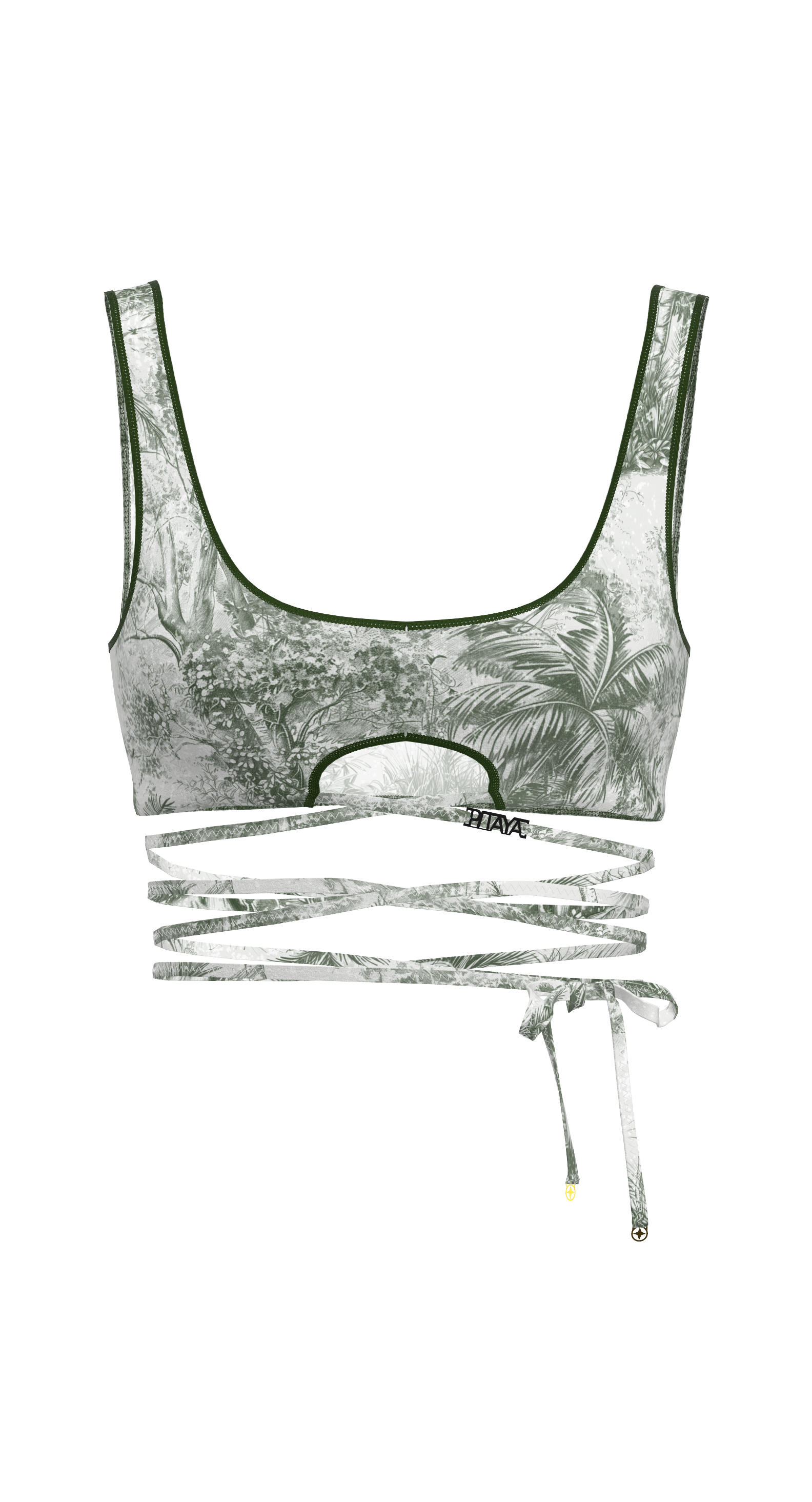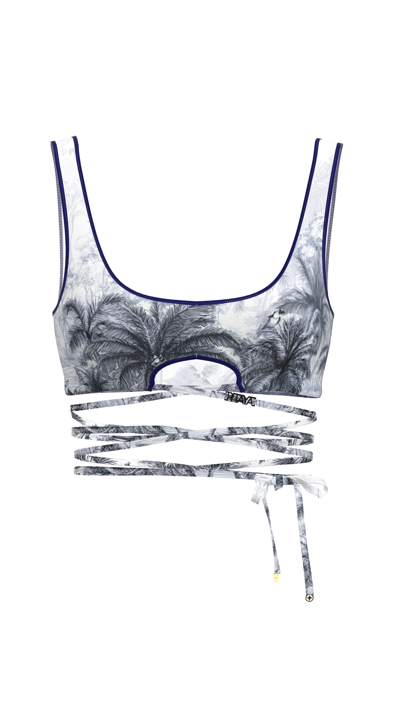 Biarritz is a tie-front top that beautifully accentuates the waist and creates a striking silhouette. The deep neckline, delicate trim, and decorative cutout under the bust add accent. The ties can be wrapped around the body to create your own variations. Perfect as a swimsuit top or as part of an outfit.